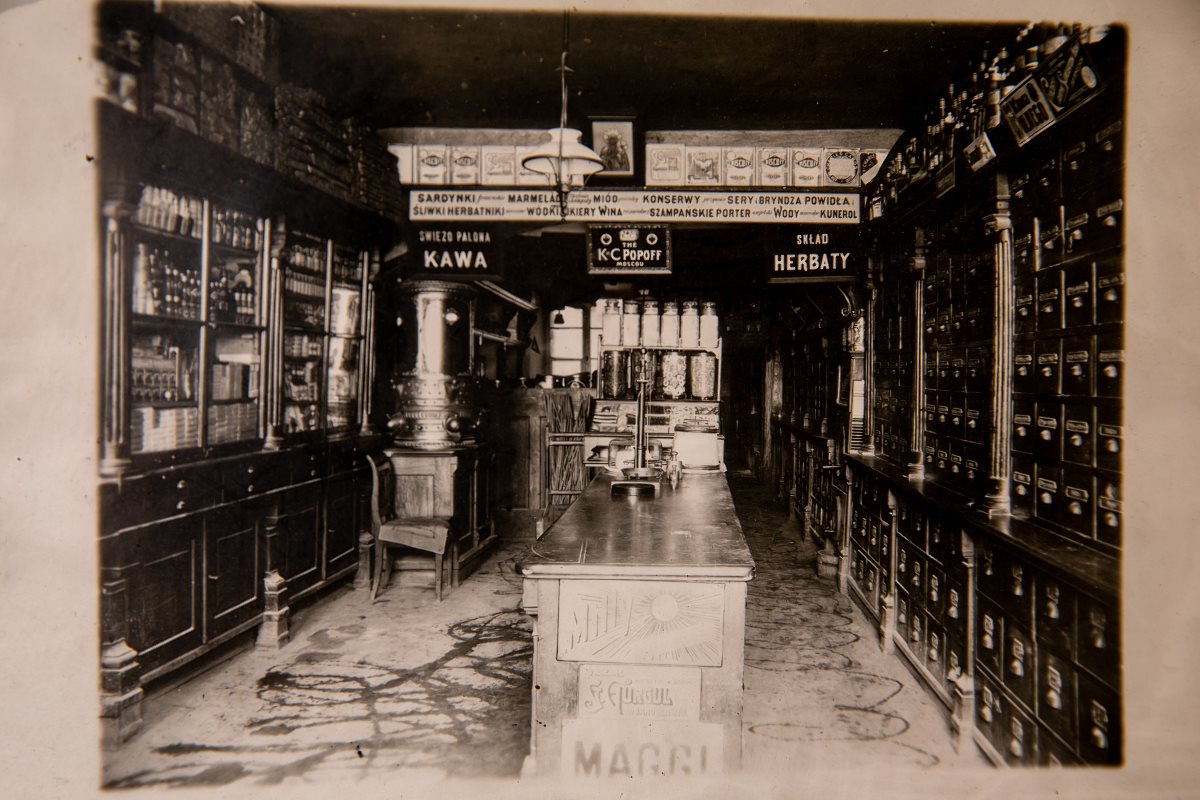 – Lokal utrzymany był w kolorach zieleni i wiśni. Pod sufitem zawieszono podświetlony witraż z wizerunkiem Matki Boskiej Częstochowskiej. Rozbudowane zostały wszystkie działy istniejące w sklepie przy ul. Kościuszki, w tym duma ojca: dział fotograficzny. On sam bardzo się nią interesował. Miał aparaty na klisze formatu 6 x 9 i 9 x 12. Sam skonstruował powiększalnik i zajmował się wywoływaniem zdjęć. Już w czasie I wojny sprawował funkcję fotografa wojskowego na froncie lwowskim. Kiedyś w czasie płukania negatywów zaskoczył go alarm i nagły wymarsz. Na rozkaz dowódcy wszyscy żołnierze kompanii nieśli w ręku niewysuszone klisze, które dzięki ich pomocy udało się ocalić. Do dziś pozostało jedno pudełko klisz wojennych ojca.