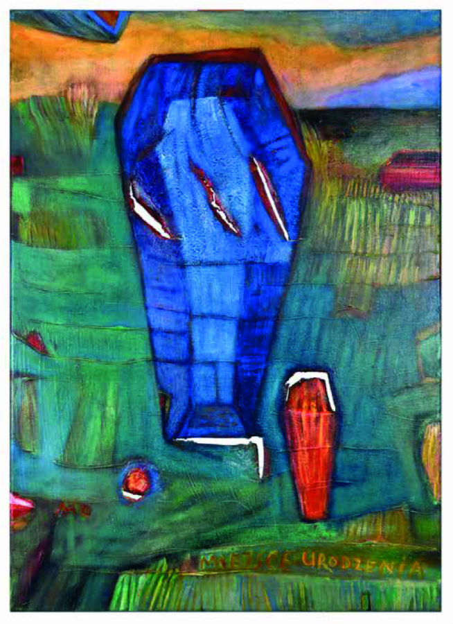 Na obrazie „Miejsce urodzenia” z 2014 roku kolorystyka na pierwszy rzut oka jest pogodna, ale widać dwie trumny. – Tu się urodziłeś, tam umrzesz – komentuje autor reprodukcję z wydanego w tym roku monograficznego katalogu „Obrazki MO. Marek Adam Olszyński. 1985/2018”. – Ja przez większość życia miałem skłonności do stanów skrajnych, dołujących. Wiem już, że muszę szukać pozytywów, aby nie zwariować. Takim bodźcem jest twórczość. W moich obrazach pokazuję ułomności świata, ale potrafię się z nich teraz śmiać. Przerabiając je na ironię, groteskę, łapię dystans.