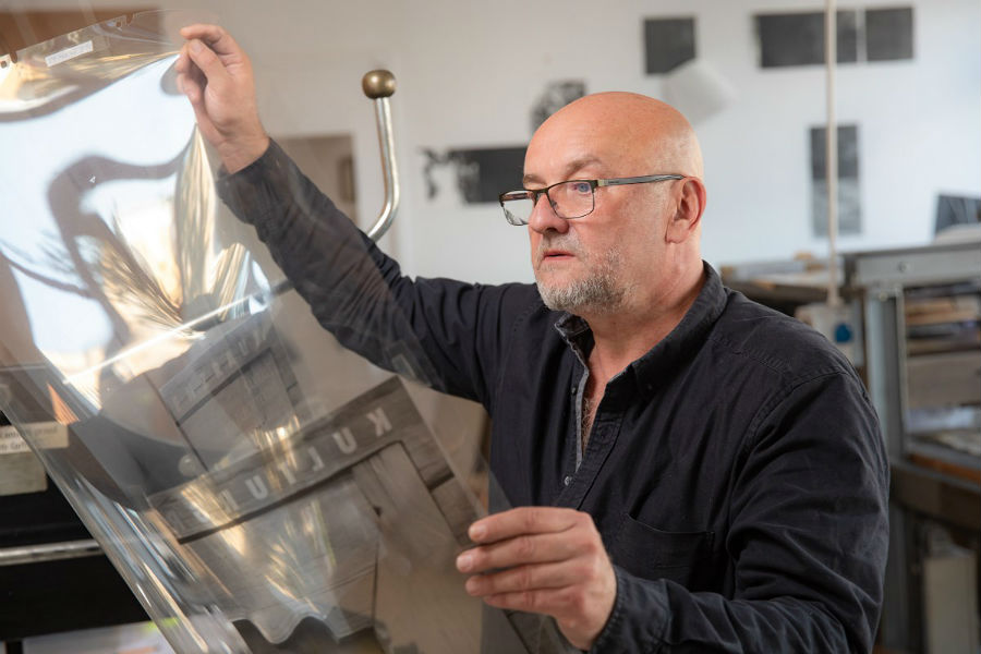 Prof. Marek Olszyński w pracowni grafiki na Uniwersytecie Rzeszowskim. Fot. Tadeusz Poźniak
