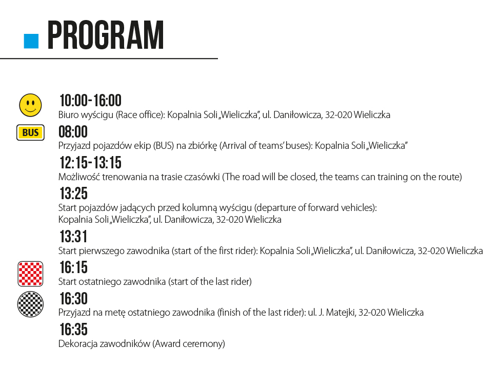 Od kilku lat etap indywidualnej jazdy na czas jest nieodłącznym elementem trasy Tour de Pologne. W tegorocznej edycji „czasówka” zakończy rywalizację, dzięki czemu do ostatnich minut wszystko będzie mogło się zdarzyć. Zawodnicy zmierzą się z 12,5-kilometrowym odcinkiem startującym i kończącym się w okolicy Kopalni Soli „Wieliczka”.