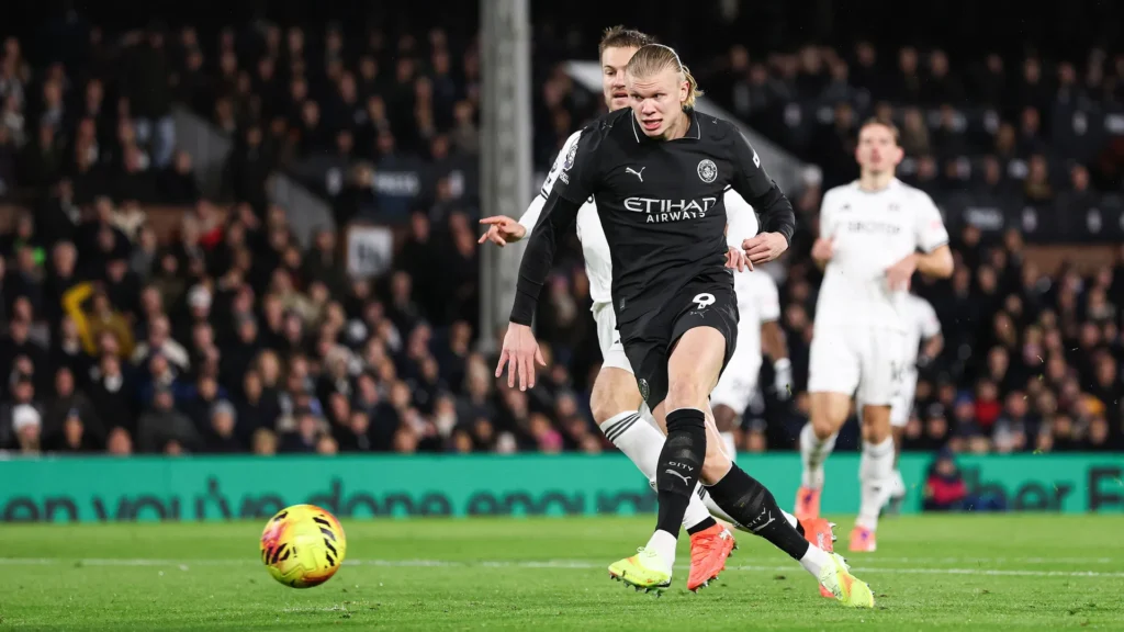 Norweg zostaje najszybszym piłkarzem, który strzelił 100 goli w Premier League, a City wygrywa 5:4 na Craven Cottage.