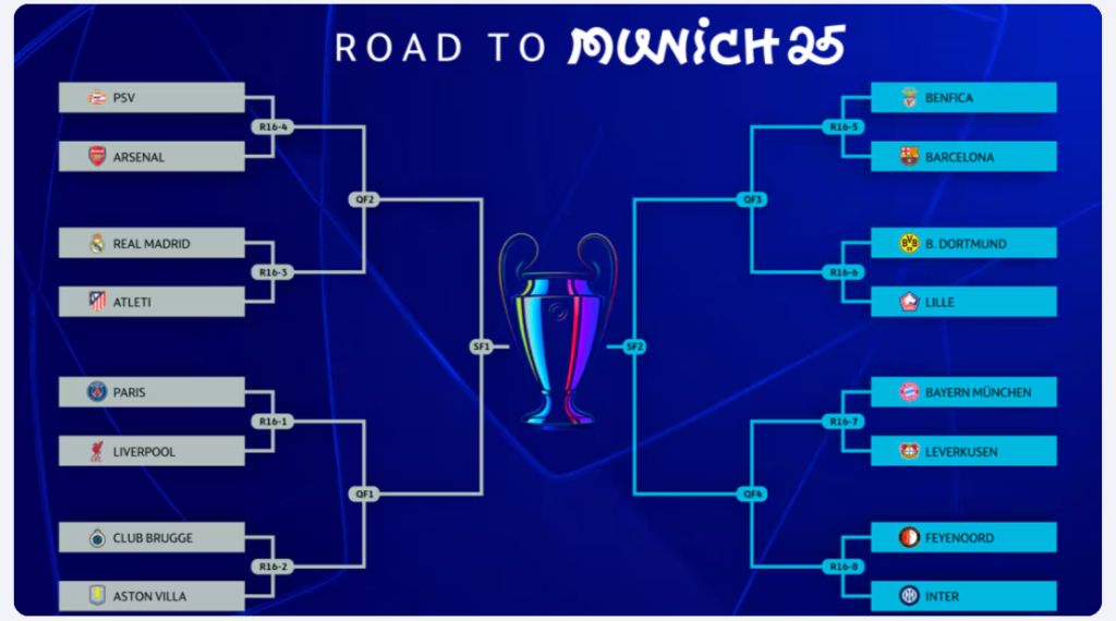 Ósme mecze 1/8 finału Ligi Mistrzów UEFA 2024/25 zostały już rozstrzygnięte po losowaniu w piątek, a losowanie par ćwierćfinałowych i półfinałowych wyznaczy również drogę każdej drużyny do potencjalnej chwały w Monachium.