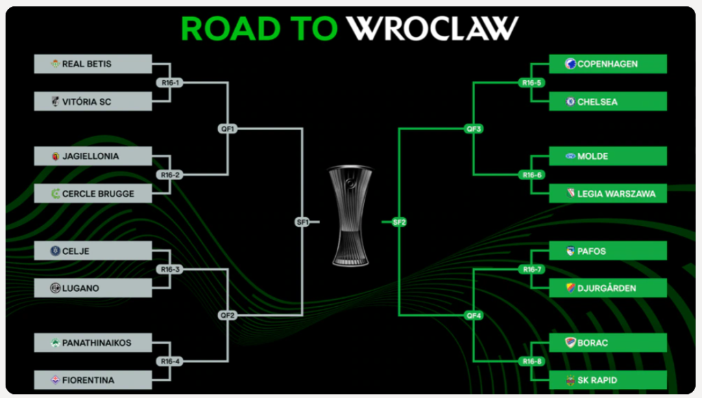 Real Betis (ESP)/Vitória SC (POR) vs Jagiellonia (POL)/Cercle Brugge (BEL)* Celje (SVN)/Lugano (SUI) vs Panathinaikos (GRE)/Fiorentina (ITA) Copenhagen (DEN)/Chelsea (ENG) vs Molde (NOR)/Legia Warszawa (POL)* Pafos (CYP)/Djurgården (SWE) vs Borac (BIH)/SK Rapid (AUT)
