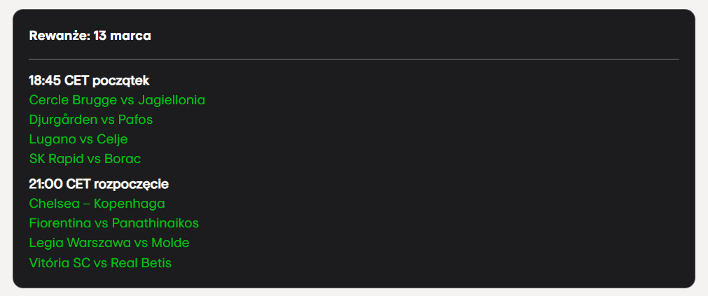 Real Betis/Vitória SC vs Jagiellonia/Cercle Brugge* Celje/Lugano vs Panathinaikos/Fiorentina Kopenhaga/Chelsea vs Molde/Legia Warszawa* Pafos/Djurgården vs Borac/SK Rapid