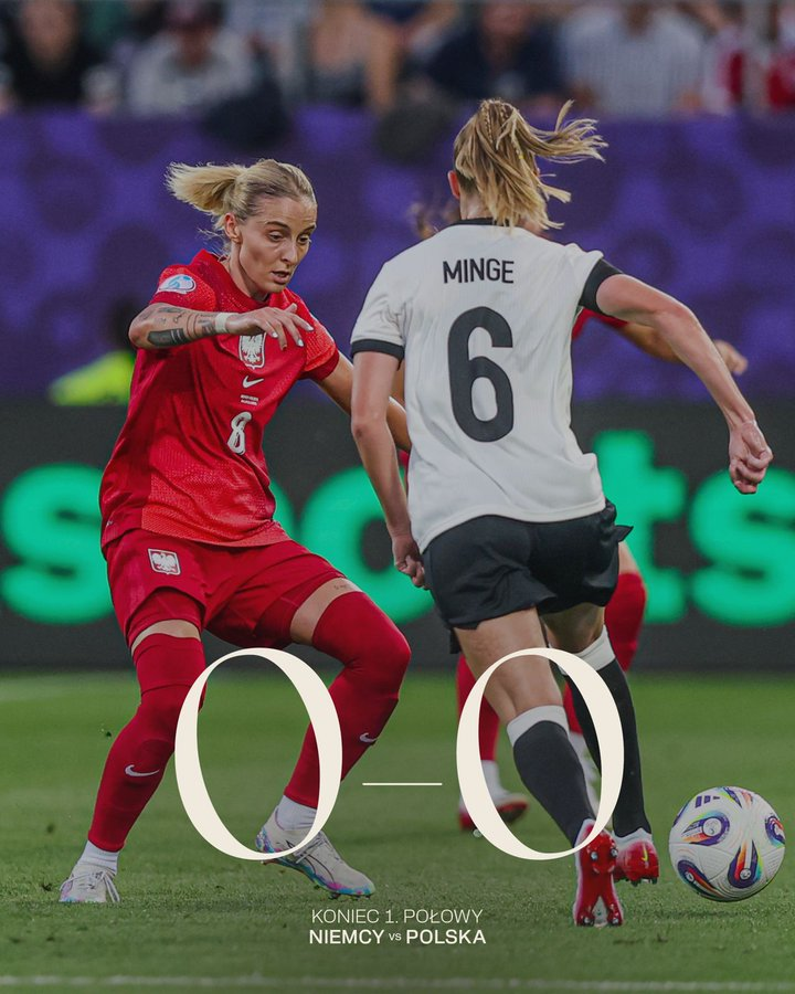 Tyle że Niemki tak łatwo nie dawały za wygraną, chciały jeszcze przed przerwą wyjść na prowadzenie. Inny plan na to miały Polski, które cały czas umiejętnie i po profesorku rozbijały ataki przeciwniczek. W doliczonym czasie tej części gry Lea Schüller zmarnowała świetną okazję. Szczęście było przy Polkach, bowiem rywalka nie trafiła w piłkę na piątym metrze. Chwilę później Klara Bühl oddała niecelny strzał z rzutu wolnego.