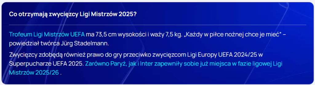 Charakterystyczne miejsca Paryża, powtórki sukcesów Interu, wybitni napastnicy i bramkarze – wszyscy znajdują się w centrum uwagi przed finałem Ligi Mistrzów UEFA. Po raz pierwszy w historii Ligi Mistrzów UEFA w 2025 roku Paryż i Inter zmierzą się ze sobą. Oto najważniejsze informacje przed decydującym meczem na Munich Football Arena w sobotę 31 maja.