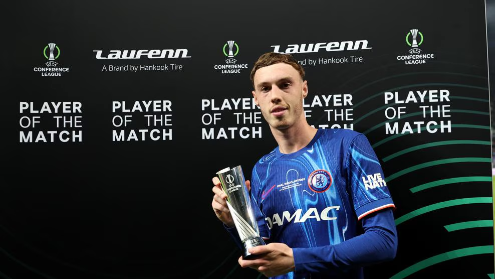 Foto: Cole Palmer z pucharem dla najlepszego zawodnika meczu finałowego Ligi Konferencyjnej UEFA / UEFA za pośrednictwem Getty Images