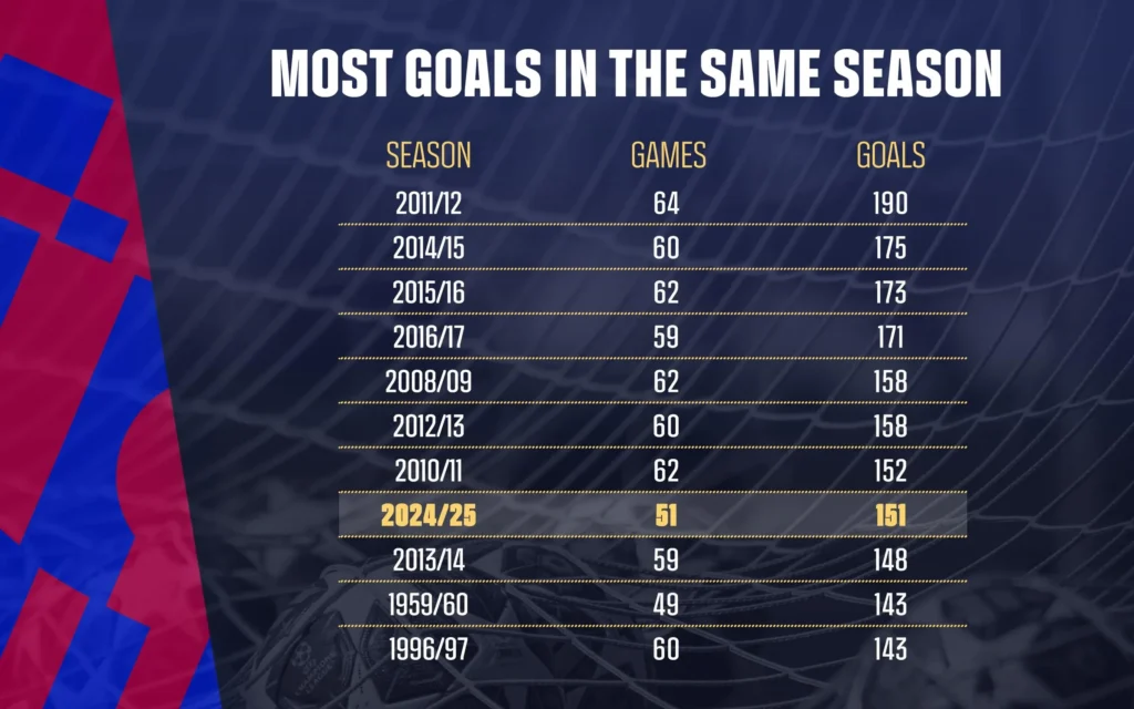 Cztery kolejne gole. To daje 151 bramek w sezonie 2024/25. Wynik, który może jeszcze wzrosnąć i przewyższyć inne historyczne rekordy w annałach FC Barcelona. Na razie drużyna zajmuje ósme miejsce na liście najlepiej punktujących kampanii po ekscytującym zwycięstwie 4-3 w La Liga nad Celtą .