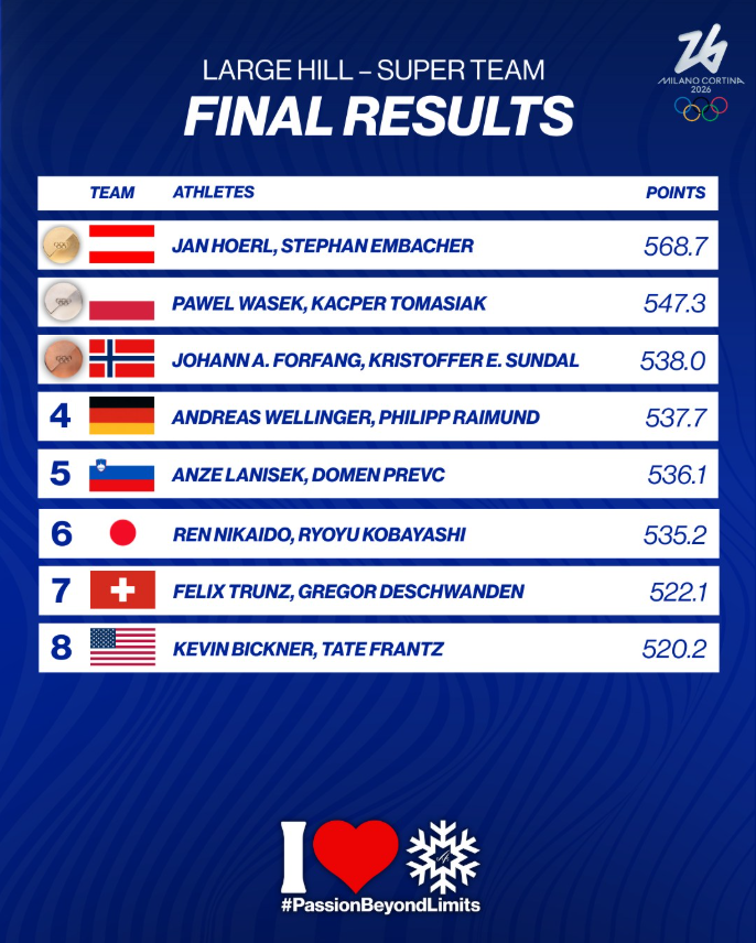 Austria w końcu zdobyła medal w skokach narciarskich na Zimowych Igrzyskach Olimpijskich 2026 w Mediolanie i Cortinie – i warto było czekać. Jan Hoerl i Stephan Embacher zdominowali konkurencję od startu do mety, zdobywając złoto w pierwszym w historii wyścigu Superdrużyn mężczyzn. Polska i Norwegia zdobyły srebrny i brązowy medal po tym, jak śnieżyca spowodowała odwołanie finału, co oznaczało, że o miejscu na podium zadecydowała klasyfikacja końcowa drugiej rundy.