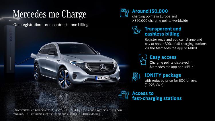 Roczna subskrypcja usługi Mercedes me Charge jest bezpłatnie oferowana nabywcom w pełni elektrycznego SUV-a EQA, a także Klasy E i GLE z hybrydowym napędem plug-in. Właściciele EQC oraz EQS w cenie pojazdu otrzymują 3-letnią subskrypcję Mercedes me Charge. Użytkownicy modeli Mercedes-EQ mogą korzystać też z rocznej zniżki na stacjach szybkiego ładowania Ionity (w cenie lub na życzenie, zależnie od wersji).