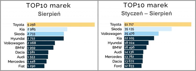 Dokładnie 5076 nowych samochodów osobowych z silnikami diesla zarejestrowano w Polsce w sierpniu tego roku. A wiecie ile w tym samym czasie sprzedano klasycznych hybryd, plug-inów oraz elektryków? Dokładnie 5963. To pierwsza taka sytuacja w historii i znak, że rynek zmienia się znacznie szybciej, niż się spodziewaliśmy. A korzystają na tym marki, które potrafią się do tych zmian dostosować. Doskonale to widać po wynikach Kia. W sierpniu została drugą najpopularniejszą marką w Polsce. A po pierwszych 10 dniach września ma niesamowite 11 proc. udziałów w rynku!