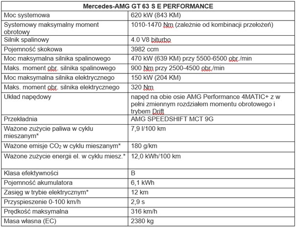 Dysponując mocą systemową 620 kW (843 KM) i maksymalnym systemowym momentem obrotowym przekraczającym 1400 Nm, Mercedes-AMG GT 63 S E PERFORMANCE stanowi nowy kamień milowy w historii firmy. Czterodrzwiowe coupé to pierwsza hybryda o wysokich osiągach, a jednocześnie najmocniejszy do tej pory seryjny model z Affalterbach. Połączenie 4,0-litrowego silnika V8 biturbo z jednostką elektryczną zapewnia mu doskonałe osiągi i wyjątkową dynamikę jazdy przy zachowaniu imponującej efektywności. Z okazji debiutu do oferty trafia specjalna seria AMG Special Edition z lakierem AMG green hell magno oraz licznymi specjalnymi akcentami na zewnątrz i we wnętrzu. Mercedes-AMG GT 63 S E PERFORMANCE jest już dostępny w sprzedaży w Polsce, w cenie od 993 900 zł; seria AMG Special Edition wymaga 103 312 zł dopłaty. Pierwsze egzemplarze pojawią się w europejskich salonach w kwietniu 2022 r.