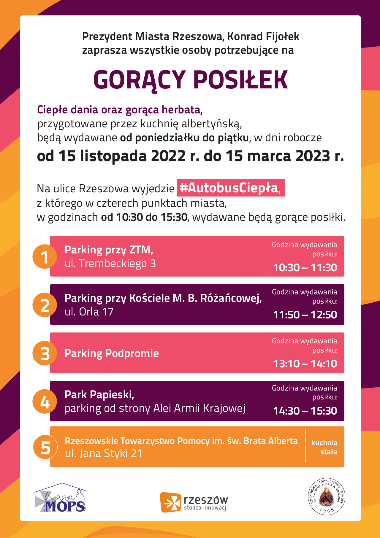 Od poniedziałku do piątku, w czterech punktach Rzeszowa, od 15 listopada 2022 do 15 marca 2023 roku dla osób potrzebujących i bezdomnych będą rozdawane ciepłe posiłki i herbata.