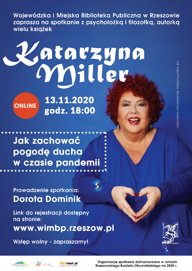 Jak zachować pogodę ducha w czasie pandemii, podpowie czytelnikom psycholożka i filozofka oraz autorka książek Katarzyna Miller. Do spotkania, 13 listopada 2020 r., można dołączyć z domu. Na platformie ClickMeeting organizuje je Wojewódzka i Miejska Biblioteka Publiczna w Rzeszowie. Rozmowę poprowadzi Dorota Dominik.