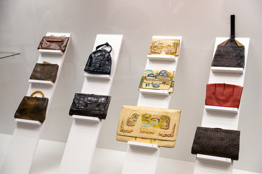 Imponujący zbiór torebek – 80 sztuk podzielony został ze względu na materiały i techniki wykonania. Najstarsze z nich pochodzą z połowy XIX wieku i są to woreczki typu reticules. W latach 20. i 30. XX wieku absolutnym dobrem luksusowym stały się wyroby kaletnicze ze skór egzotycznych gadów: węża, krokodyla, warana. Synonimem elegancji stała się „mała czarna” torebka do ręki. Rarytasem jest niewielka walizka ze słynnej wytwórni Wilardy, z dużym lusterkiem wewnątrz, wykonana z lucitu, syntetyku modnego w latach 50. XX wieku, także wśród gwiazd Hollywoodu.