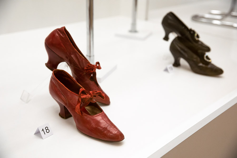 – Z tego okresu mamy też trzy szykowne staniki oraz pończochy i skarpetki z jedwabiu, zastąpionego w XX wieku przez włókna syntetyczne – tłumaczy kuratorka wystawy. Z początku XX wieku pochodzą pantofle wykonane z wężowej i krokodylowej skóry. Podobnie trzewiki ze spiczastymi noskami z nubuku. Wszystkie na stosunkowo niskich, bardzo wygodnych obcasach, co wskazuje na rozwój kobiecej niezależności i mobilności, jakie nastąpiły w XX wieku. Zachwycają różowe pantofle buduarowe z londyńskiego Harrods’a wykonane z pikowanej tkaniny i wykończone bawełną.