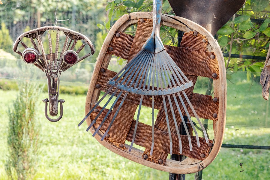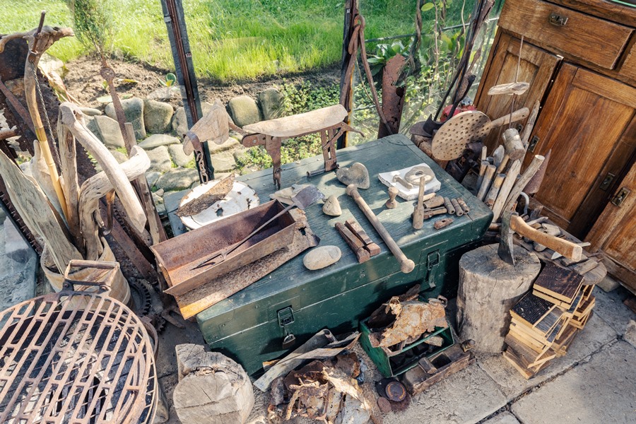 W szklanej altance na działce artysty poukładane starannie w szafkach leżą kawałki starego drewna: fragmenty desek, gontów, narzędzi stolarskich, a nawet podkładów kolejowych. Są spróchniałe i połamane, wygładzone w strugach deszczu. Niektóre z nich – równo przycięte spoczywają w pedantycznie ułożonych stosikach. Obok żelazny, fantastycznie powyginany złom pokryty rudą patyną rdzy.