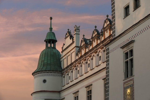 Ten zespół arcydzieł fotografować jest niezmiernie trudno. Można zrobić to w konwencji pocztówki, na której „widać wszystko” – a tak naprawdę nie oglądamy niczego ciekawego. Można również zaprosić wybitnego fotografika, który wrażliwy jest nie tylko na piękno natury, lecz także architektury dawnych wieków. Przed rokiem pisałem – przy okazji wydania albumu Tadeusza Budzińskiego o zamku w Krasiczynie – iż każda jego publikacja staje się wydarzeniem artystycznym. Teraz należy to stwierdzenie powtórzyć. Artysta fotografik wybiera niewielki fragment zamku i ukrywa go wśród zieleni starego parku. Kiedy indziej rozerwaną koronkę manierystycznej attyki umieszcza obok zrywającego się do lotu stada ptaków. Ich szaro-grafitowe upierzenie jest identyczne jak kolor gzymsu. Na innym ujęciu czarne kontury drzew z rozkwitającymi pączkami kryją niespokojną linię bielącej się w głębi attyki. Kontrast czerni i bieli łagodzą pasma złocistego ugru na pilastrach. Finezyjny cień kraty pada na kolumny krużganków dziedzińca pogrążającego się w ciemniejącym błękicie podczas zachodu słońca. Tylko na podłuczu arkady widać jego delikatny różowawy refleks.