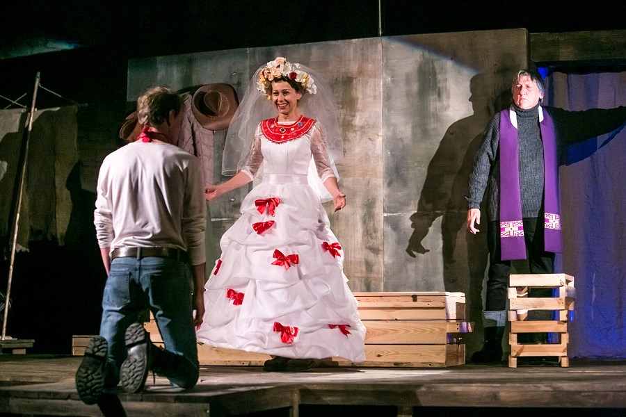 Teatralna opowieść snuje się właśnie wokół Jędrka i jego żony Grażyny. Przemysław Sejmicki w nieśmiertelnym kowbojskim kapeluszu, bandanie, chudy – zdaje się Jędruś Połonina jak żywy, przed laty król bieszczadzkiej bohemy, który na koniu wjeżdżał do knajpy i nigdzie dłużej nie zagrzał miejsca. Mariola Łabno – Flaumenhaft, świetna w roli jego żony Grażyny. Piękna, pełna nadziei w sukni ślubnej i odarta z bieszczadzkich złudzeń w waciaku.
