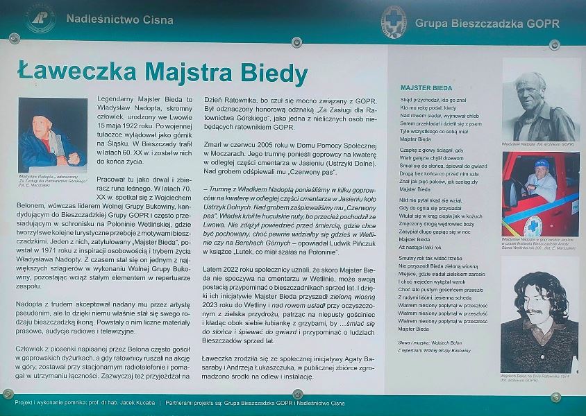 – Skoro Majster Bieda nie może leżeć na cmentarzu w Wetlinie, niech swoją postacią przypomina o bieszczadnikach sprzed lat. Niech przyjdzie „zieloną wiosną” do Wetliny i siądzie na oczyszczonym z zielska przydrożu, patrząc na niepusty gościniec, kładąc obok swój skromny plecak, może łubiankę z grzybami czy jagodami… Niech przycupnie nieopodal sklepu, by przypomnieć czasy ludzi wolnych – dodaje Edward Marszałek, rzecznik prasowy Regionalnej Dyrekcji Lasów Państwowych w Krośnie. Ławka stanęła z inicjatywy emerytowanego sołtysa z Wetliny, Andrzeja Łukaszczuka i Agaty Basaraby, która przed laty mieszkała w Cisnej i znała Majstra Biedę. W ubiegłym roku zorganizowano internetową zbiórkę pieniędzy na odlew i instalację ławki z postacią Majstra Biedy.