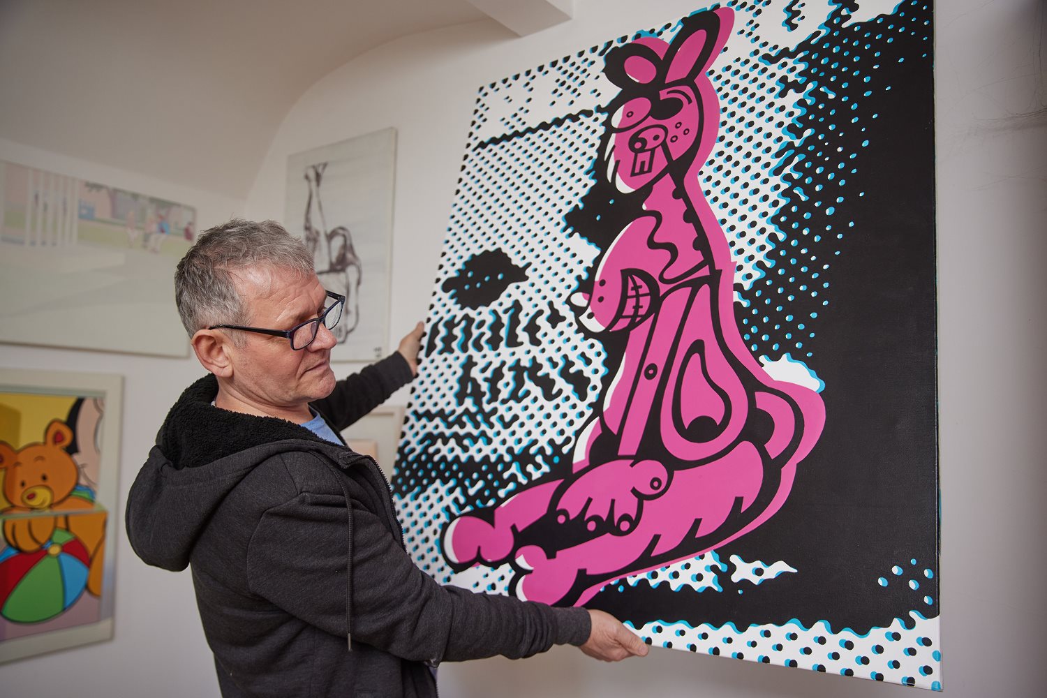 – Mimo to, tak się tym interesowałem, że całe życie poświęciłem sztuce. Fascynuje mnie. Właśnie współczesna. Oczywiście, zaczynałem jak wszyscy, od klasycznej, ale później szukałem coraz więcej. W pewnym momencie już klasyka nie wystarcza. Szuka się dalej. Czegoś nowego. Wrażeń, zagadki. Rozszyfrowanie kodu, którym posługuje się artysta, daje dużo satysfakcji. Podobnie jak w muzyce nowoczesnej. Trzeba się z nią obyć, znać się, przejść etapy i nauczyć się czytać współczesny, artystyczny kod – mówi Pastuła i przymierza do ściany w Porębach Kupieńskich różowego królika – kawał świetnego pop-artu Macieja Wieczerzaka, którego nie powstydziłaby się londyńska galeria Saatchi.