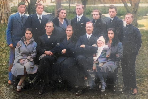 Szopowie w domowym ogrodzie w Przemyślu w 1932 r. Władysław w marynarskim mundurze drugi od lewej w dolnym rzędzie. Fot. Archiwum Rodziny Szopów