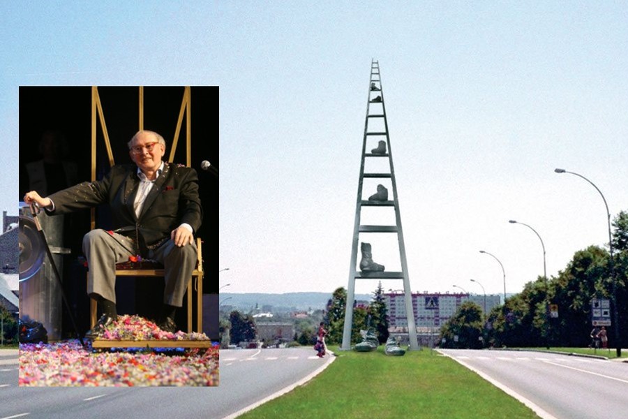 Drzewa rosnące na pasie między drogami były wtedy ledwie sadzonkami. Dziś nieco przesłaniają widok, ale wtedy panorama miasta była jak na dłoni. Widzieli to w wyobraźni: monumentalna drabina, na niej buty, a przez prześwity widok na miasto. Dialog tych co odeszli z tymi, którzy żyją.