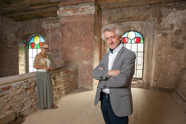 Dyskutujemy na temat ikonostasu. Mam w duszy ideę ikonostasu ze szkła. W cerkwi została tylko szafa – jego szkielet. W związku z tym, że ikonostasu nie ma, to jego odwzorowywanie byłoby złe z dwóch powodów. Po pierwsze, bo nie wiemy, jak to wyglądało, a po drugie – byłoby naśladownictwem i nie miałoby wartości autentyku. Jestem przeciwny odtwarzaniu tego, co było na ścianach i sklepieniach. To jest bardzo dobrze udokumentowane przez kalki i zdjęcia. Można pokazać w cerkwi na planszach, jak to wyglądało. Wolę o tym miejscu myśleć w sposób nowoczesny i otwarty. Połączyć tę starą bryłę, stary kamień z czymś niezwykłym. Nie tynkować cerkwi wewnątrz, zostawić ją w kamieniu. Wyspoinować, zrobić ościeża okien, odtworzyć w nich malowane krajki. Pokazać, co jest zachowane i takie jak kiedyś, a co nowe. I w tym umieściłbym nowoczesny ikonostas. Tamtego starego już nie ma. Ten nowy to cień ikonostasu, z duchami świętych. Wyobraziłem więc sobie taflę szkła z napylonymi złotem cieniami. Zarysy postaci, które są archetypiczne i bez trudu je rozpoznajemy – głowa, aureola, szata, ręce w różnych pozycjach, Matka Boska z dzieciątkiem. Cała tafla szkła podświetlana od dołu jest gigantyczną złotą ścianą. Przezierną, ale złotą. Trzy otwory, drzwi…